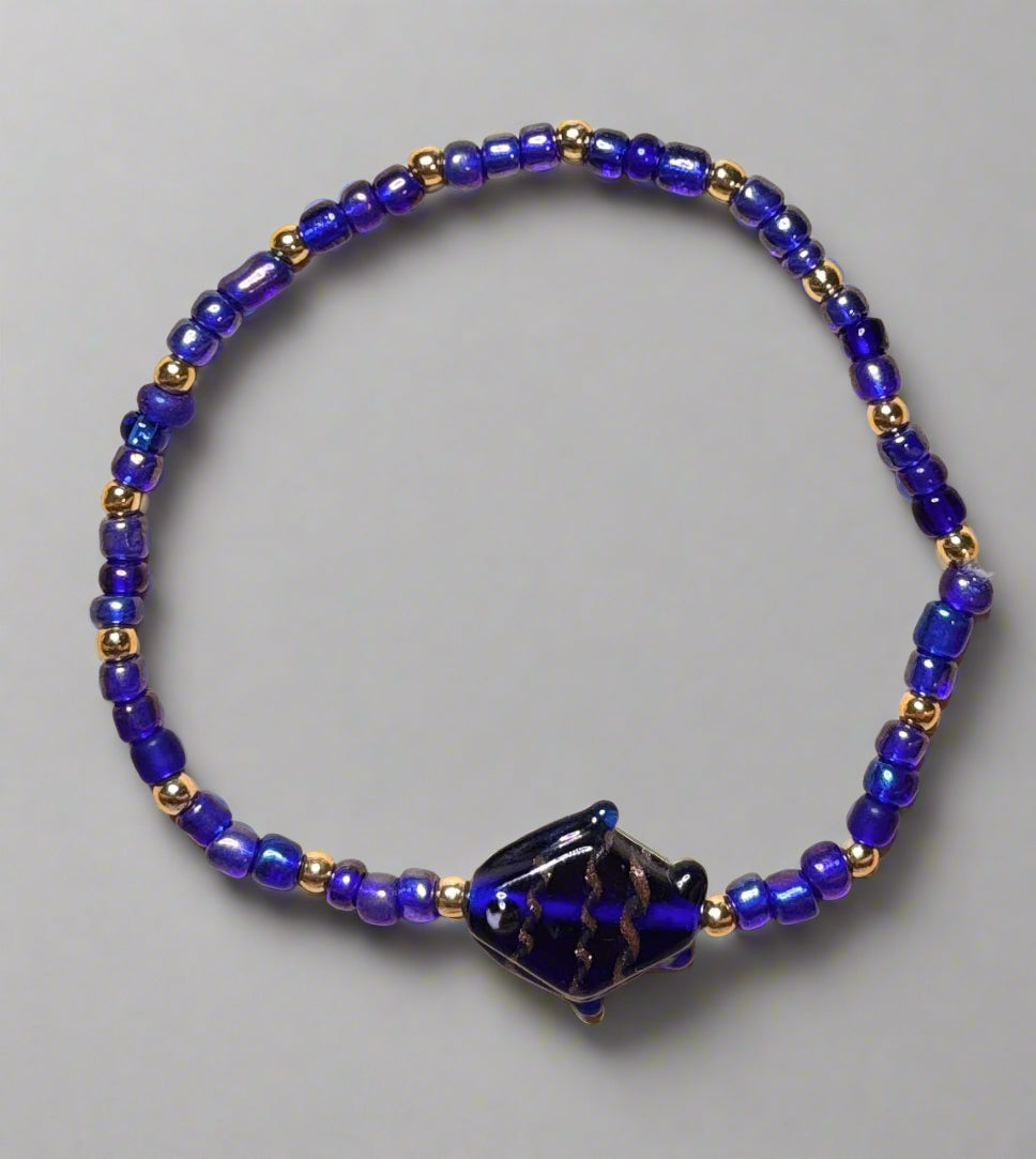 This handmade 7-inch stretch bracelet combines rich blue and gold beads with a captivating blue glass fish charm, creating a truly unique accessory. Its elastic design ensures a comfortable fit for all-day wear, while the stunning glass charm adds an artisanal touch that draws the eye. Perfect for adding a splash of color and character to any outfit, this bracelet is a versatile piece that blends craftsmanship with style effortlessly.