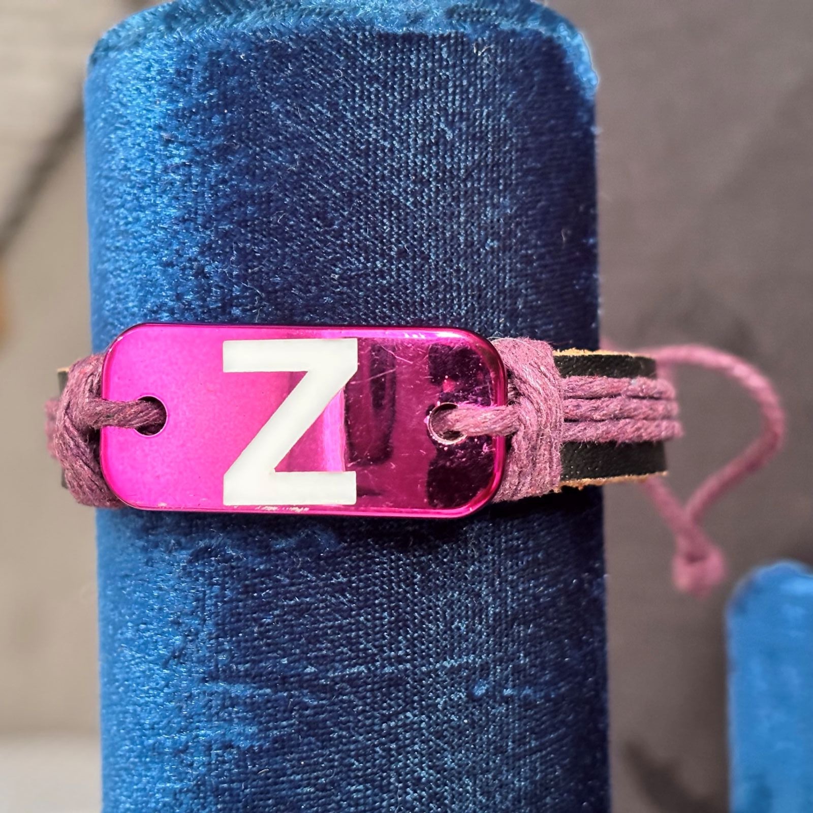 Stand out from the crowd with our handmade "Z" Initial Bracelet! Made of supple leather with a bold purple string accent, the silver Z charm adds a touch of adventure to any outfit. Wrist strap is adjustable to be pulled tight or loose. Make a statement and embrace your daring side!