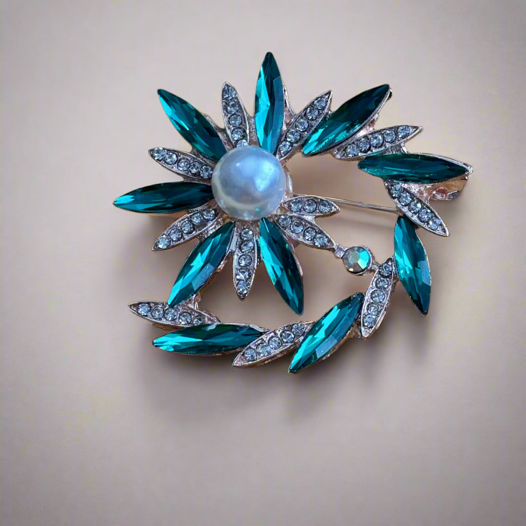 Adorn yourself with sophistication and exclusivity with our Brooch - a stunning flower crafted from sparkling rhinestones and shimmering emerald gems that encircle a lustrous pearl. Elevate your style with this elegant piece, perfect for adding a touch of luxury to any outfit.