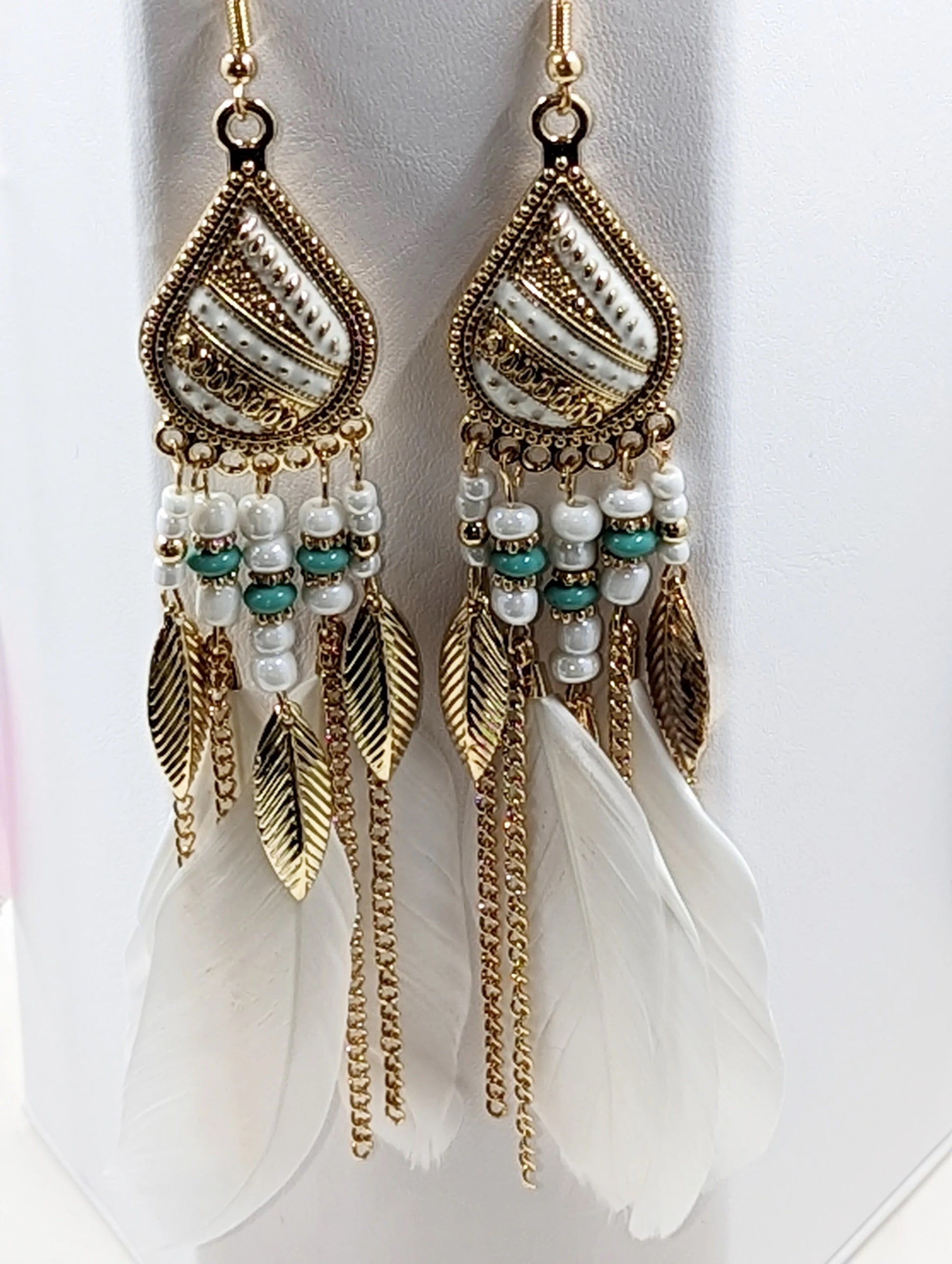 Earrings - White Feathers with Golden and White Beads