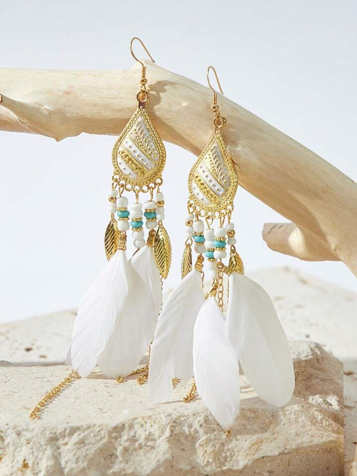 Eye catching design these fashion Bohemian style earrings made with white and teal beads and colorful feathers.