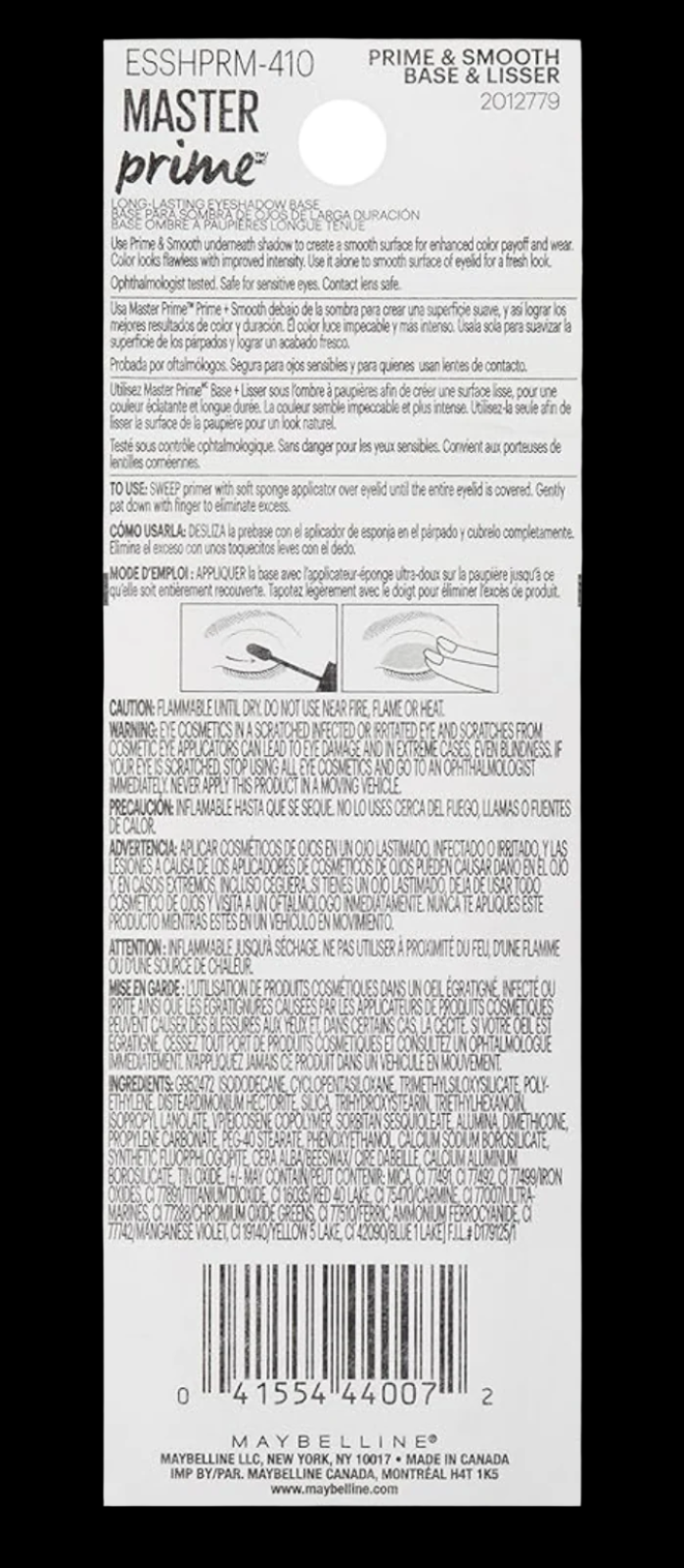 The EyeShadow Base - Master Prime #410 by Maybelline provides a smooth, primed canvas that enhances your eyeshadow’s color and longevity. This long-lasting base helps your eye makeup stay vibrant and crease-free, ensuring a flawless look all day. Perfect for creating a polished and enduring finish.