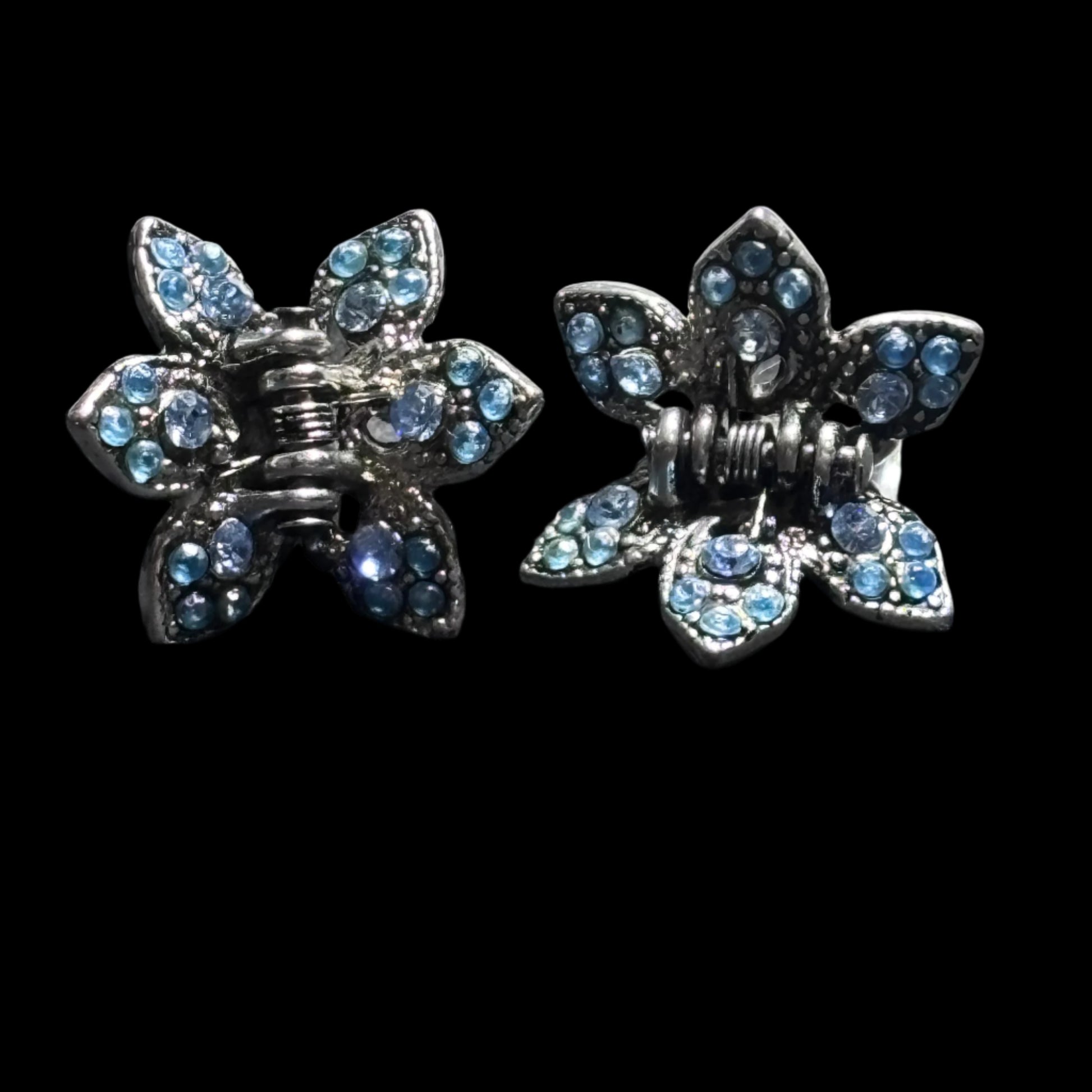 Hair Clips - Set of 2 - Flower shaped with Blue Rhinestones