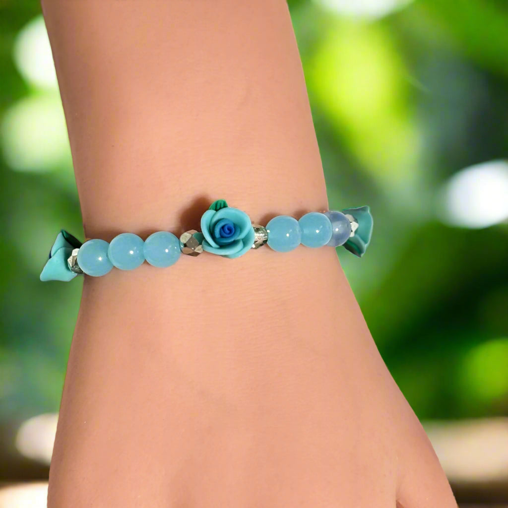 The Handmade Aqua Bloom Bracelet features shimmering turquoise glass beads that capture the essence of tranquil waters. A delicate rose flower charm adds a touch of natural elegance, evoking timeless beauty and freshness. This 7-inch bracelet blends refined craftsmanship with a floral design, perfect for those who appreciate subtle sophistication and enduring style.