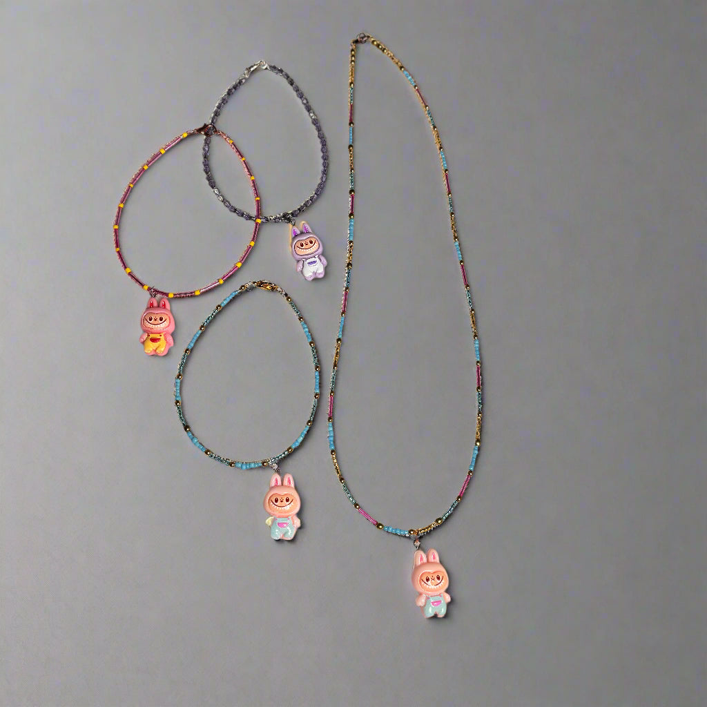 Add a playful pop of color and charm to your look with these handmade beaded jewelry pieces! Each bracelet shines with its own colorful bead combo and a cute Bunny charm, while the necklace sparkles with light blue, pink, and gold beads, finished off with matching Bunny pendants in pink and blue. Mix, match, or wear them solo—these delightful accessories bring a fun, whimsical vibe to any outfit. Perfect for brightening your style with a touch of joyful personality!
