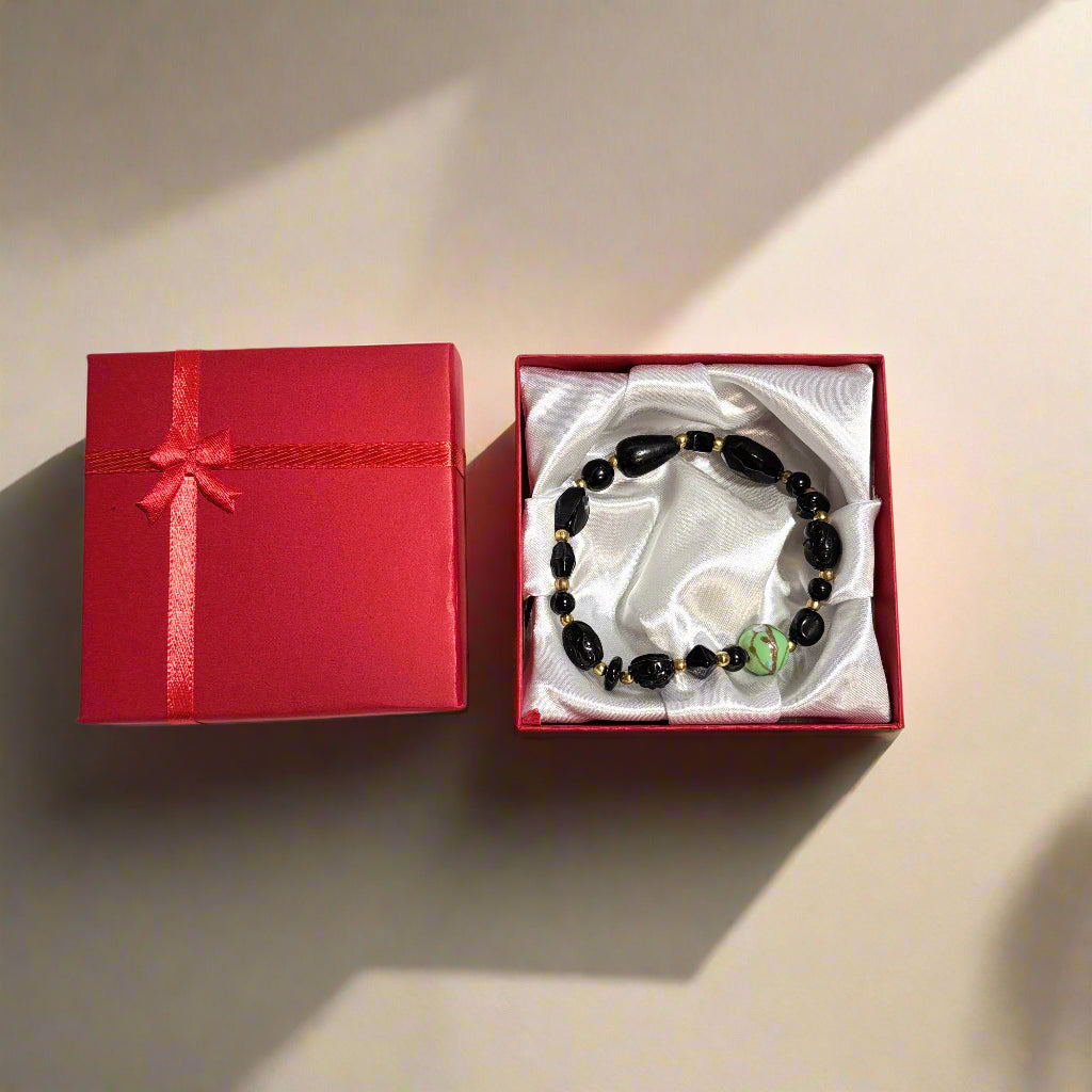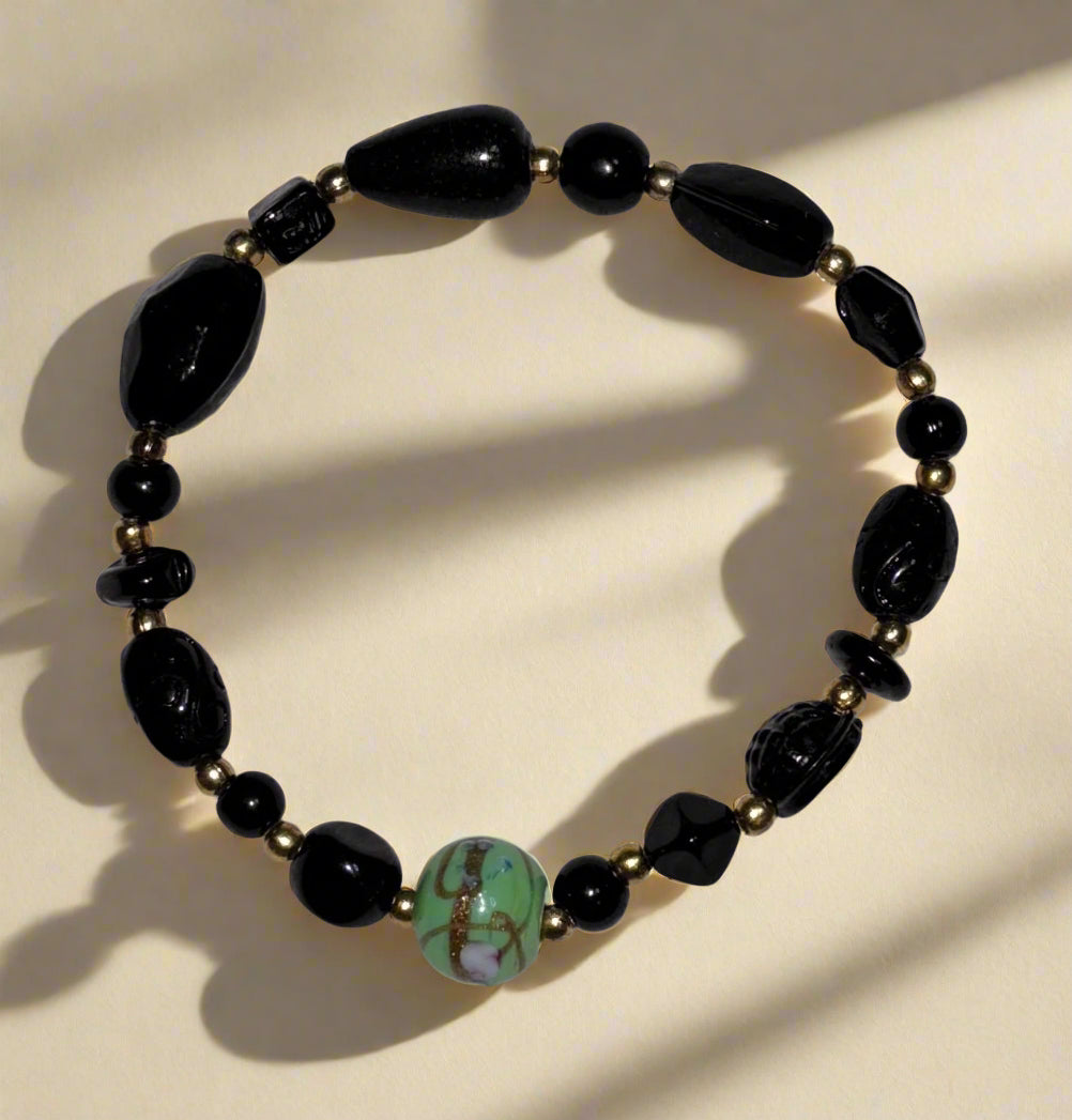 This handmade black beaded bracelet features a sophisticated mix of deep black beads in various shapes and sizes, accented by a single prominent round bead with a unique light green textured finish. The combination of smooth and faceted beads adds refined visual interest. Strung on an elastic cord, it ensures comfortable wear and easy fit, measuring 8 inches in length.