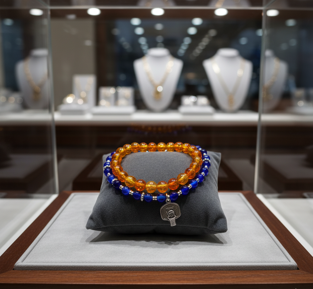 Celebrate game day with this expertly crafted Florida-inspired double strand bracelet. Featuring bright orange and blue faceted glass beads that capture the vibrant team colors, it includes a striking silver-tone basketball hoop charm that showcases your sports enthusiasm. The lobster clasp ensures secure wear while adding a subtle pop of color. Measuring 8 inches, this handmade bracelet blends spirited design with quality materials, making it the perfect accessory to show your Gators pride in style.
