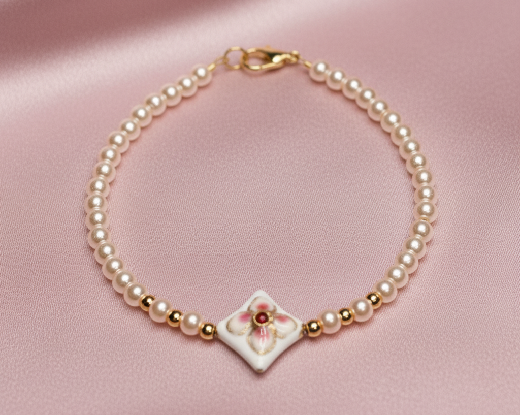 This elegant 7-inch bracelet showcases a diamond-shaped ceramic bead hand-painted with delicate pink petals and a vibrant red center. Surrounding it are lustrous cream and pale pink pearl-like beads, complemented by clusters of metallic gold-toned accents. Secured with a gold-tone lobster clasp, this piece offers a refined blend of subtle colors and graceful shine, perfect for adding a touch of sophistication to any outfit.
