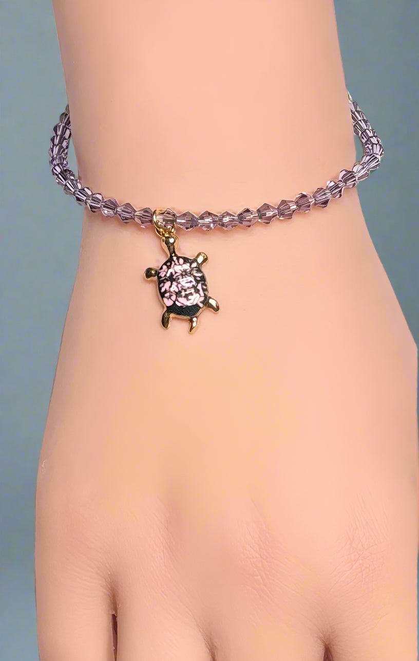 This elegant 9" handmade bracelet features richly faceted purple beads that catch the light with every movement. Accented by a gold-tone purple turtle charm, it adds a refined touch of charm and uniqueness. The barrel twist clasp ensures a secure and seamless closure, combining style with practicality for everyday wear or special occasions.