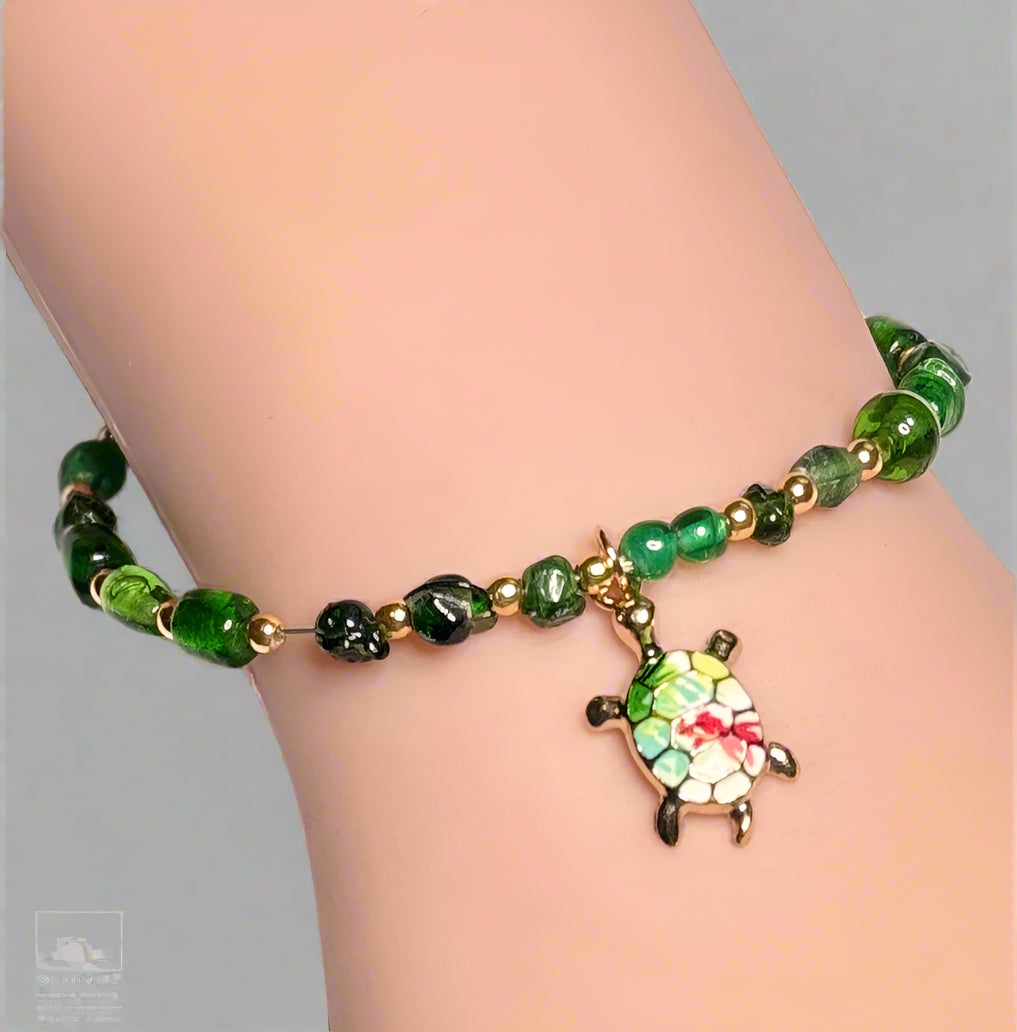 This sophisticated 9-inch handmade bracelet showcases an elegant blend of green beads in diverse shades and shapes, accented by delicate gold-tone spacers. At its center, a striking colorful turtle charm with green details adds a unique focal point. Finished with a secure barrel clasp, this bracelet beautifully combines artistry and wearable charm.