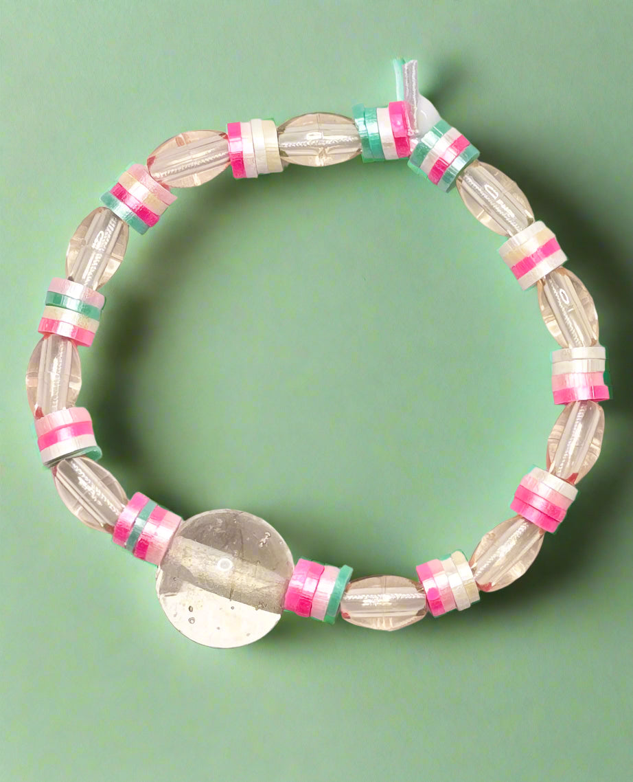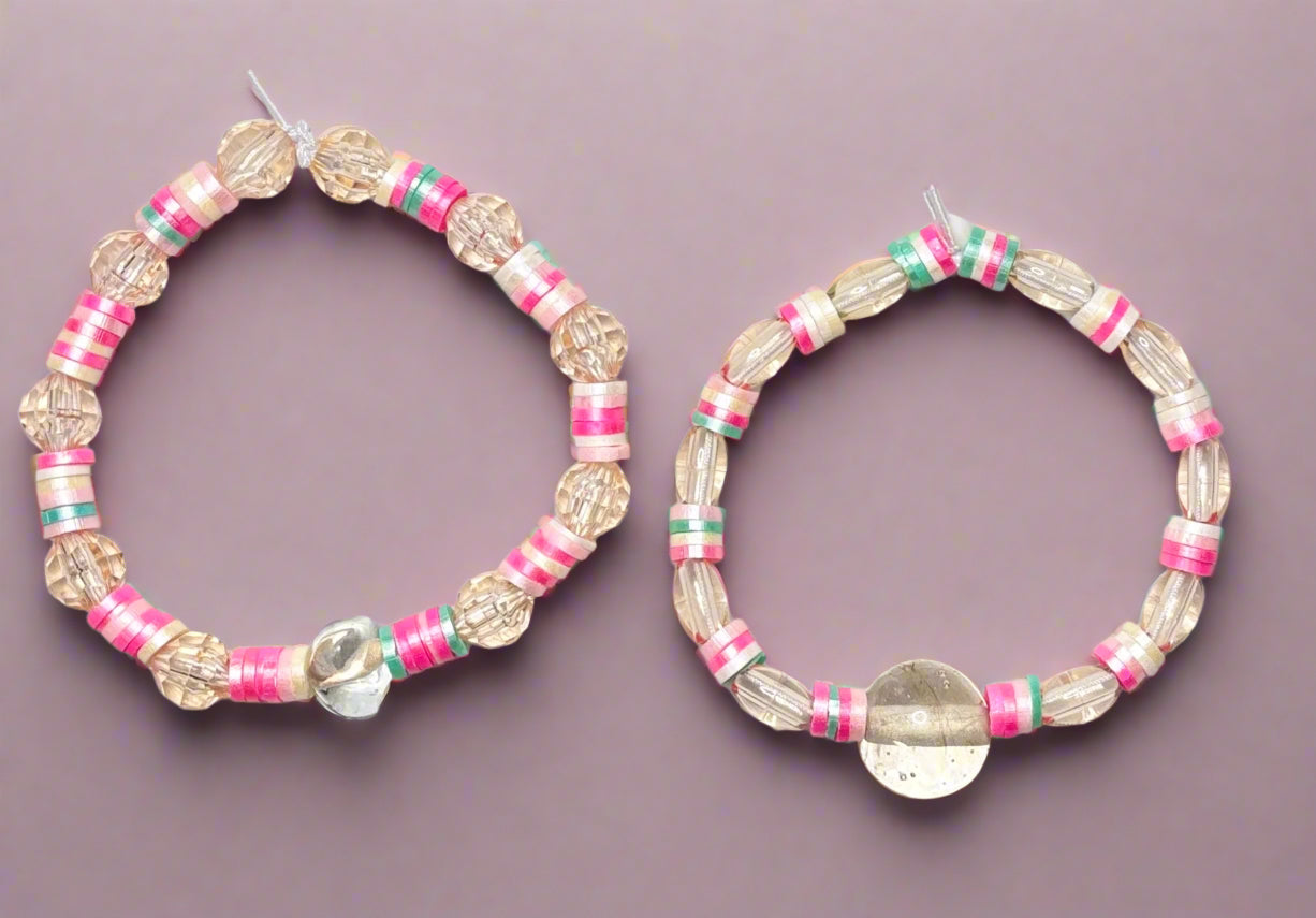 This refined set of two handmade stretch bracelets showcases faceted clear beads paired with delicate flat disk spacers in elegant hues of pink, white, and green. Each bracelet is highlighted by a distinctive larger bead at its center, combining subtle color and craftsmanship for a graceful accessory that effortlessly complements any look.