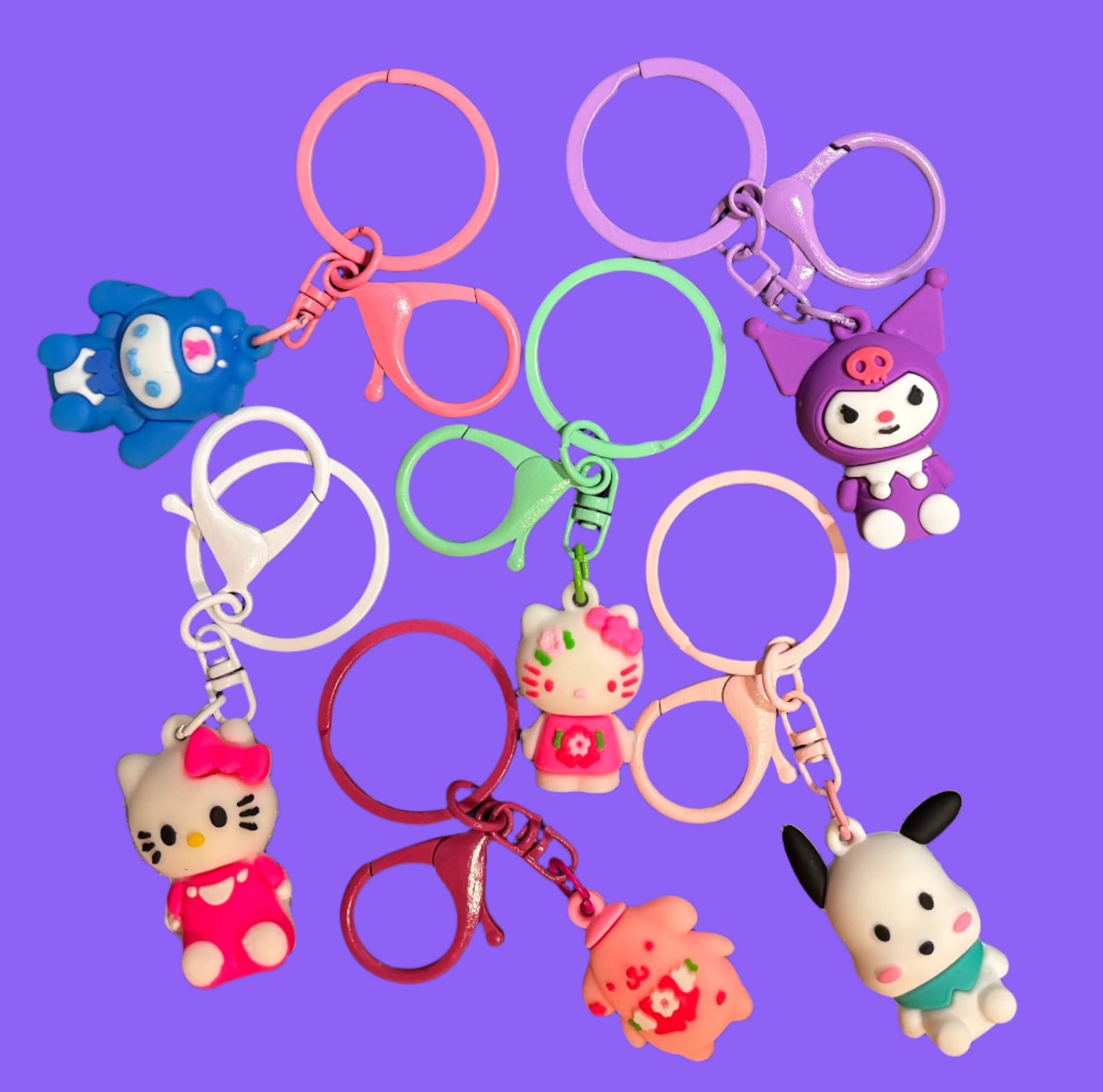 Keep your keys cute and easy to find with our Hello Kitty and Friends keychains! Each chain features a different character ...Hello Kitty, Cinnamoroll, or My Melody with a lobster clasp for easy attachment. Perfect for fans of Sanrio, these PVC rubber charms are both durable and adorable.