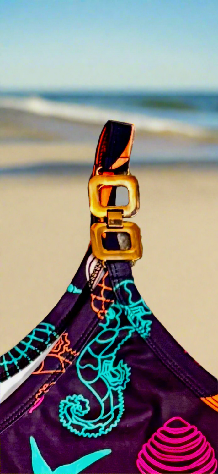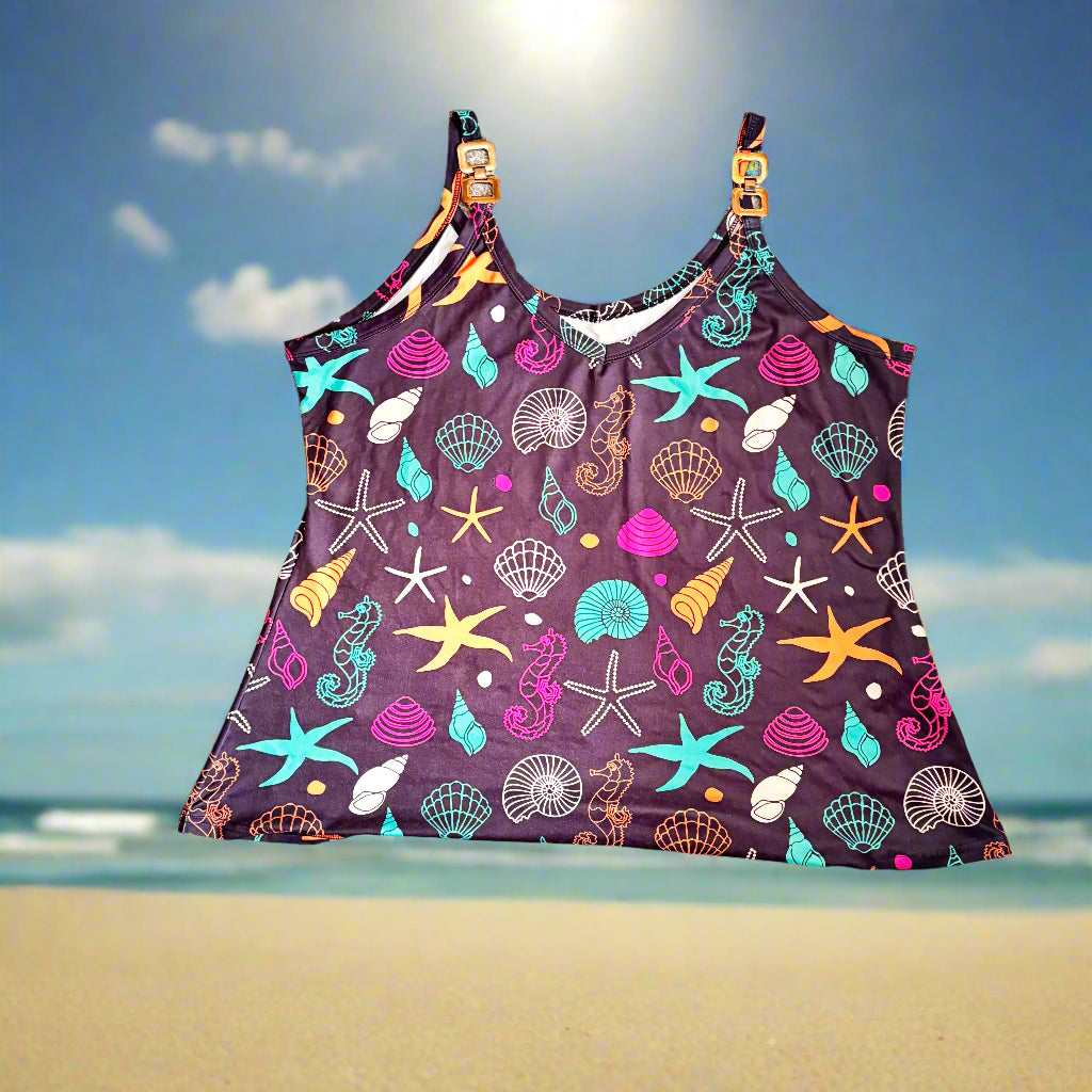 Ladies Tank Top - Seashell Print with Golden Metal Buckle Accents