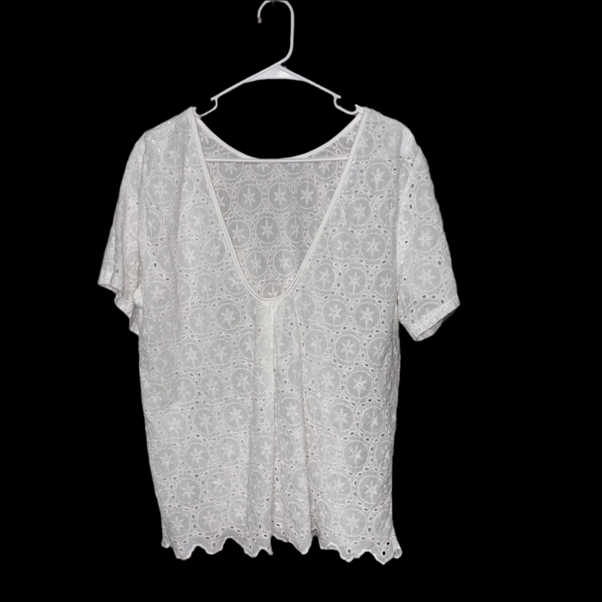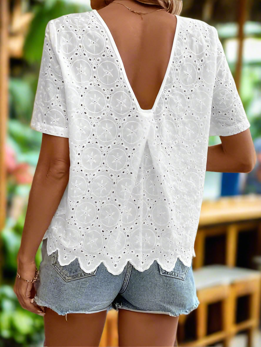Ladies Top - White - Eyelet Design with Deep V Back and Scalloped Hem