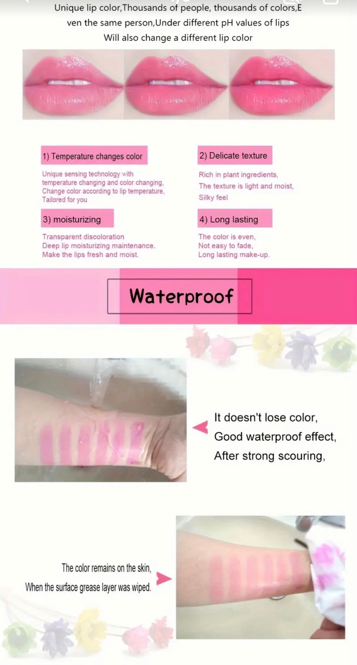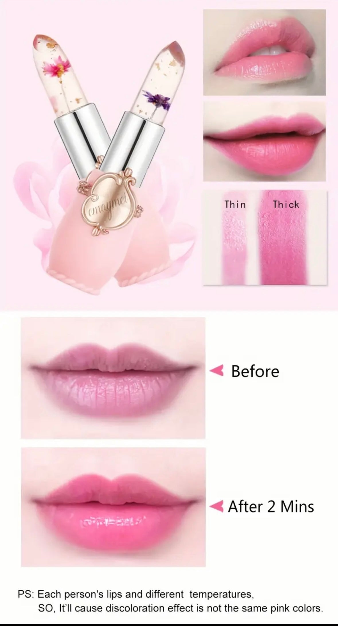 Discover a new level of lip care with our Lipstick - Waterproof Color Changing Moisturizer! Our innovative formula reacts to your lips' temperature, revealing a unique color while delivering long-lasting hydration. Enjoy a smooth and soft pout all day with our Crystal Jelly lipstick, featuring a beautiful flower inside. Elevate your lip game now!
