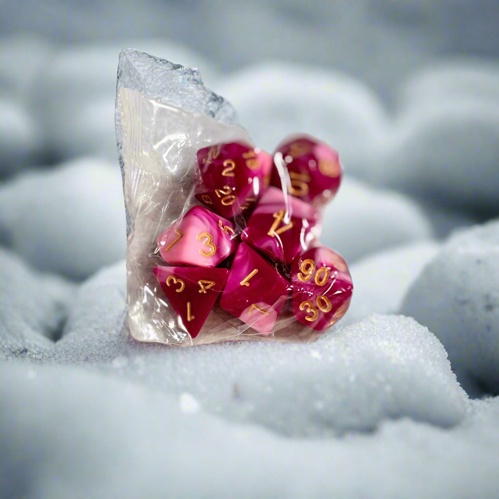 The MDG Resin Polyhedral Dice set includes seven 16mm dice crafted from resin, featuring an icy textured exterior and a vibrant, flashy sequin core. Numbers are outlined in white or silver for clear visibility during gameplay. Available in six distinctive color schemes— Icy Opal Red, Sunfire Blaze (red-orange), Gemini Blue/Gold, Viper Venom (green/yellow), and Arctic Ocean Swirl—these dice combine reliable performance with striking aesthetics, making them ideal for a variety of RPGs and tabletop games. Each set of dice comes with a Velvet Drawstring Bag.