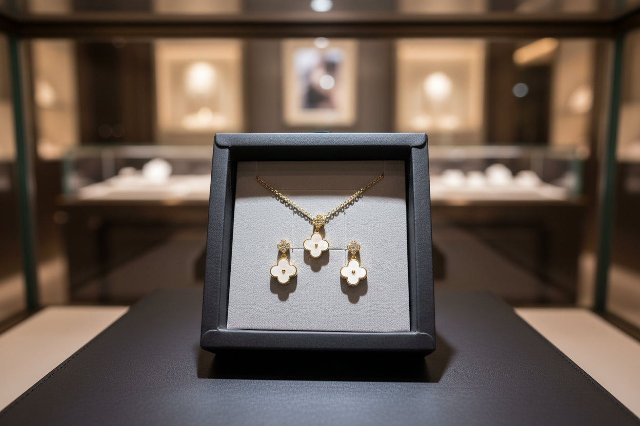 Inspired by the coveted Alhambra design language, this necklace and earring set showcases a four-leaf clover pendant adorned with a pavé border of brilliant cubic zirconia stones. A complementary smaller clover charm with a central stone sits gracefully on the chain, creating layered visual interest. The white mother-of-pearl inlay provides luminous contrast against the warm gold-plated sterling silver setting, delivering both sophistication and durability. Each piece balances classic elegance with contemporary styling, making it equally suited to refined everyday wear or evening occasions. A meaningful symbol of fortune, this set brings timeless luxury to your collection.