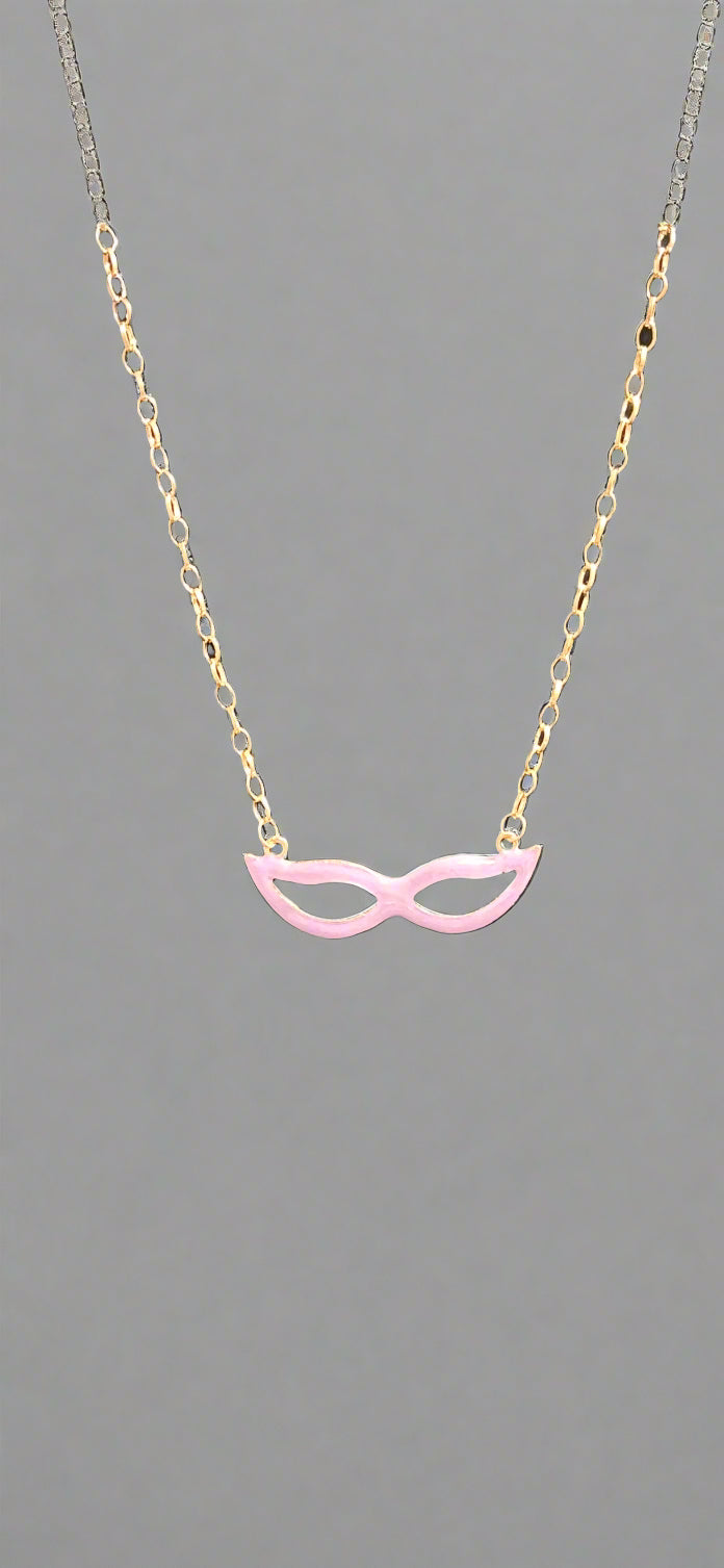 This elegant necklace features a whimsical pendant shaped like cat eye glitter glasses, blending playful design with refined style. The purple pendant is complemented by a gold-tone pull-over chain, approximately 32 inches long, offering a graceful drape. Perfect for adding a subtle yet sophisticated touch to any outfit.