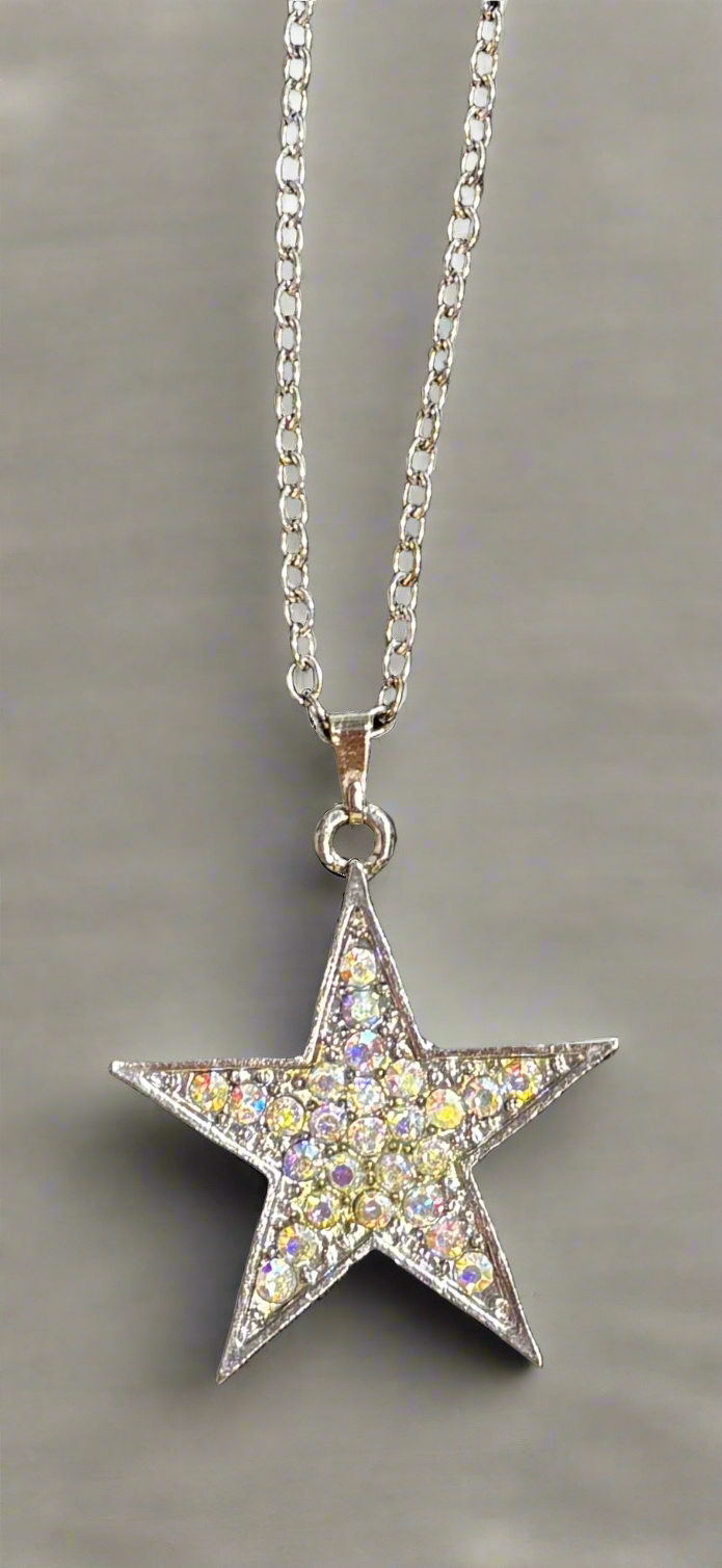 Dare to command attention with this eye-catching rhinestone star necklace. The iridescent stones catch and scatter light with your every movement, creating a mesmerizing cosmic effect. The generous 26-inch pull-on chain offers versatile styling options, letting you layer or wear it solo for maximum impact. This stellar accessory isn't for the faint-hearted—it's for those who aren't afraid to shine.