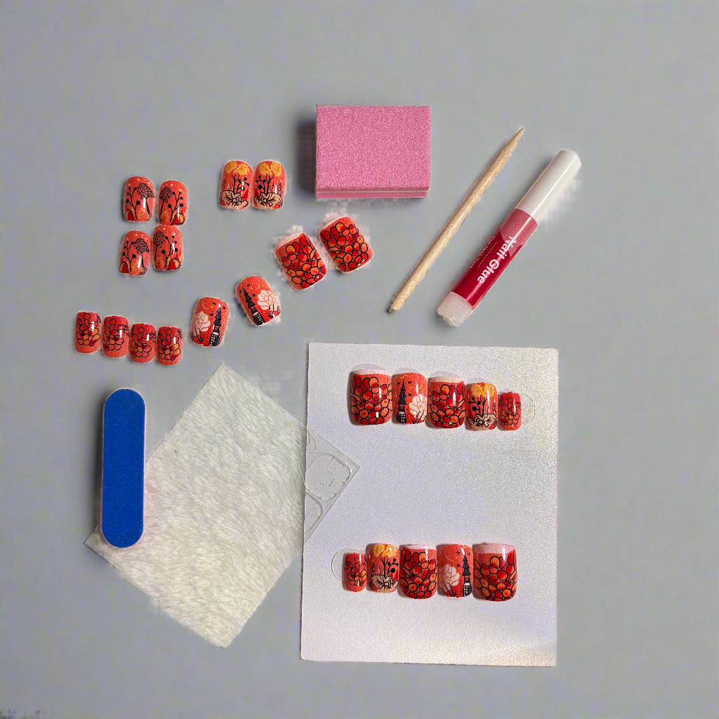These short square press-on nails showcase an autumn theme with red and orange fall foliage set against a black background. Featuring intricate designs inspired by Japanese and East Asian art, the nails highlight a striking tower or pagoda motif, blending cultural elegance with seasonal beauty.