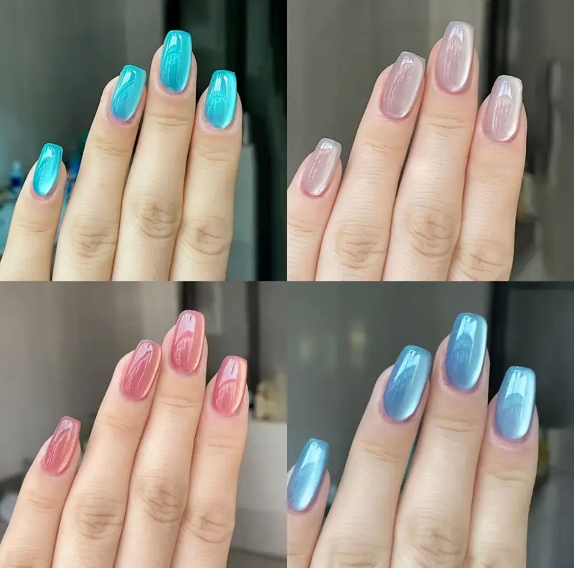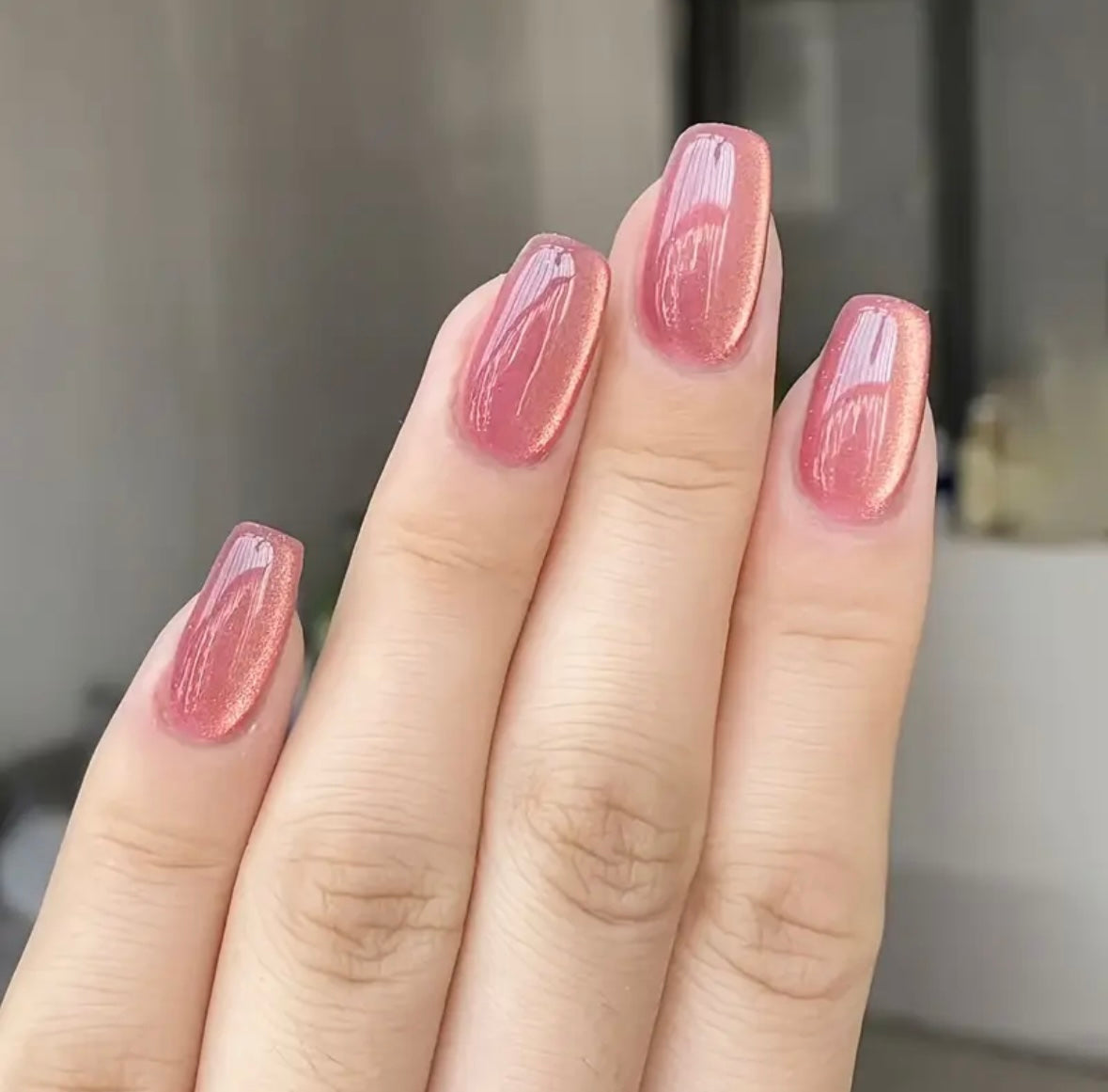 Transform your manicure with our Press on Nails - Cat Eye Effect. Our medium square nails feature a stunning shimmering reflective finish that changes with the light, giving your nails an alluring cat eye effect. Available in pink, light pink, purple, and blue, these glossy nails will elevate your style with ease and sophistication.
