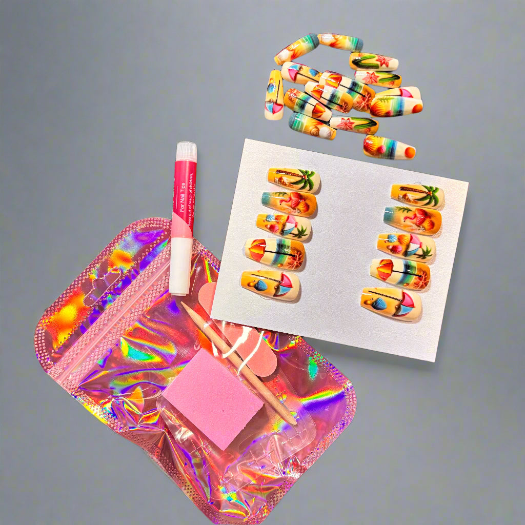 Bring a splash of summer to your fingertips with these Flamingo Beach press-on nails. Featuring medium-length coffin shapes, each nail showcases vibrant hand-painted designs inspired by tropical beaches—think sunny yellows, ocean blues, lush greens, and playful pinks. Perfect for adding a fun, vacation-ready vibe to any look without the hassle of a salon visit.