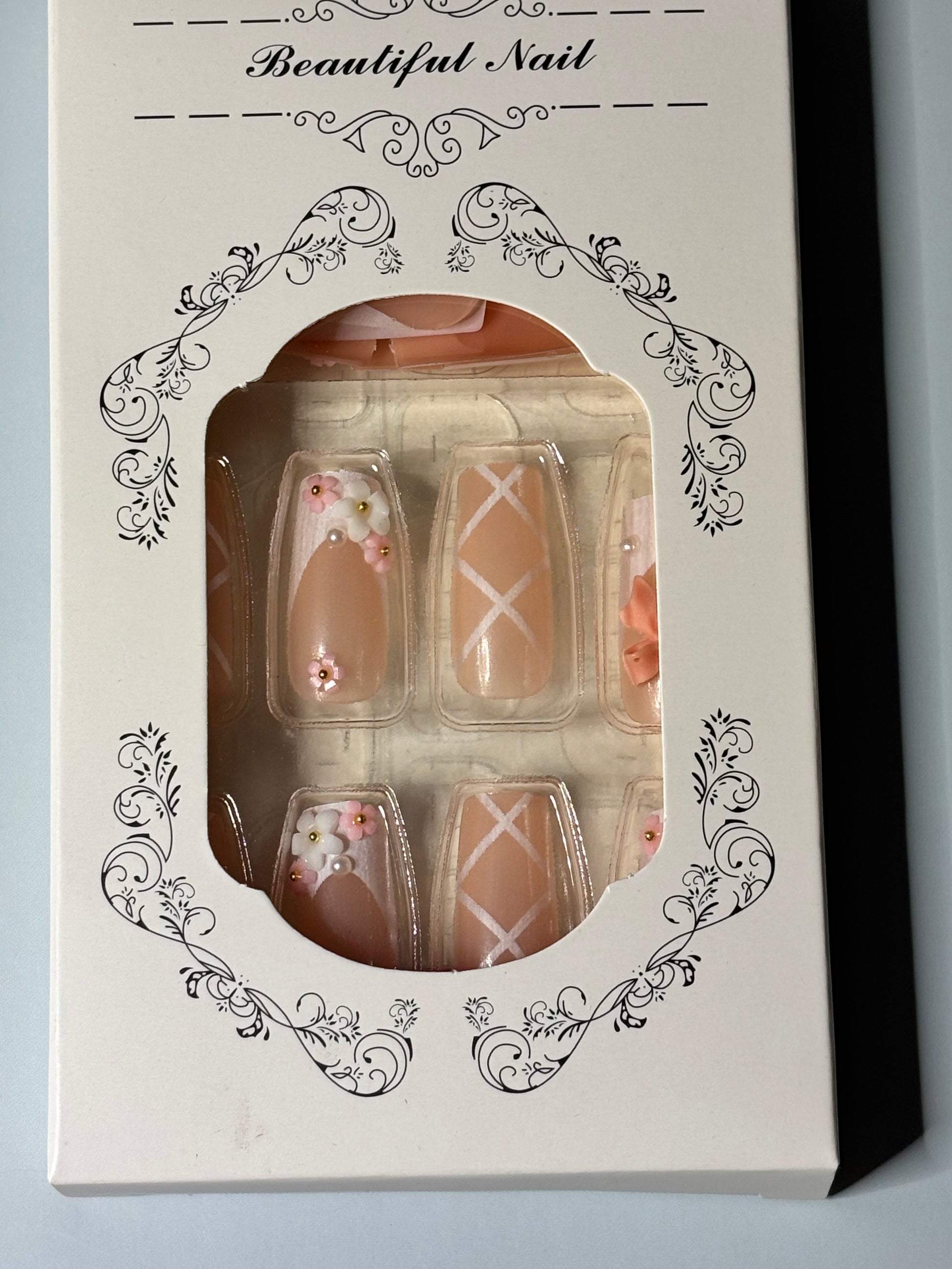 Elevate your style with our Pressed On Nails French Manicure. Featuring a delicate nude and white color palette adorned with floral accents and bows. No need for salon visits, our set includes adhesive sticks and a nail file for easy application. A luxurious, time-saving option for a flawless, effortless look.