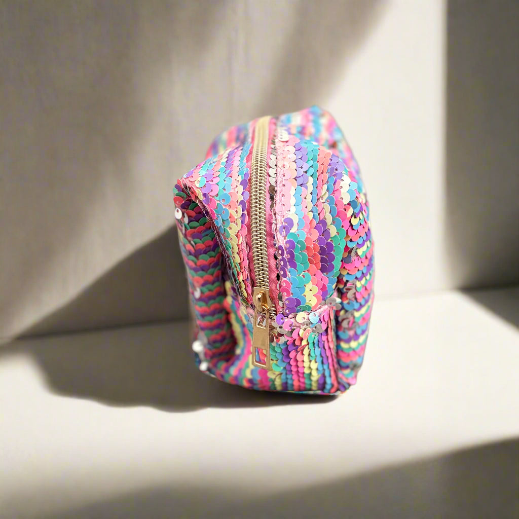 The Rainbow Sparkle Pouch is a vibrant and eye-catching accessory with an iridescent exterior covered in multi-colored sequins that create a dynamic rainbow effect. These sequins reflect light to add subtle sparkle, enhancing any outfit or occasion. Its secure zippered closure ensures your essentials stay organized and protected. Despite its compact size, the pouch offers ample space for makeup, accessories, coins, or small treasures. The contrasting interior lining adds sophisticated visual interest, making this pouch an expert choice for stylish everyday use or as a distinctive gift.