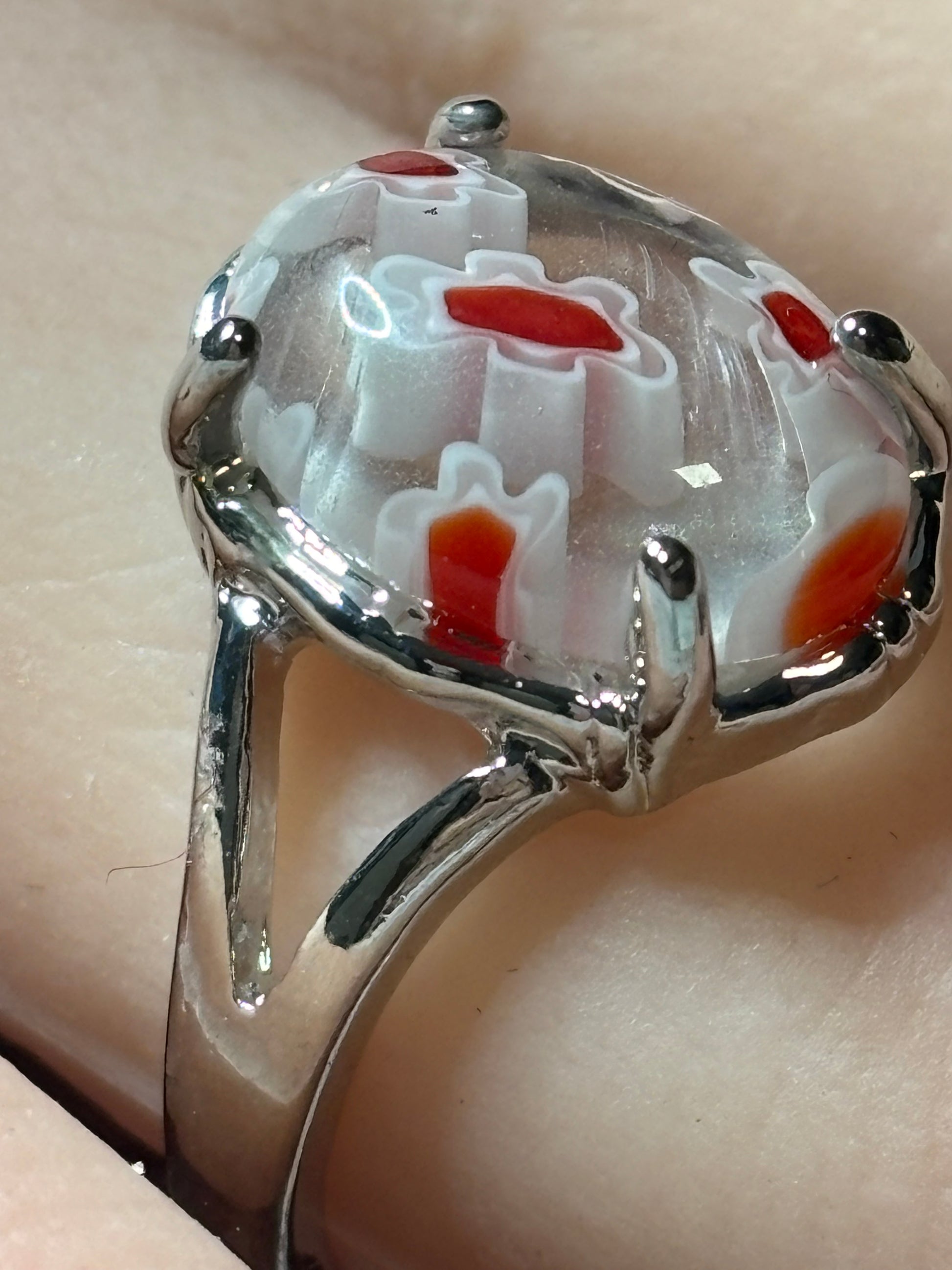 Indulge in luxury with our elegant Ring. Featuring a stunning combination of clear, white, and red floral murano, this size 10 piece is a true masterpiece. Let it adorn your finger and elevate any outfit with its sophisticated style.