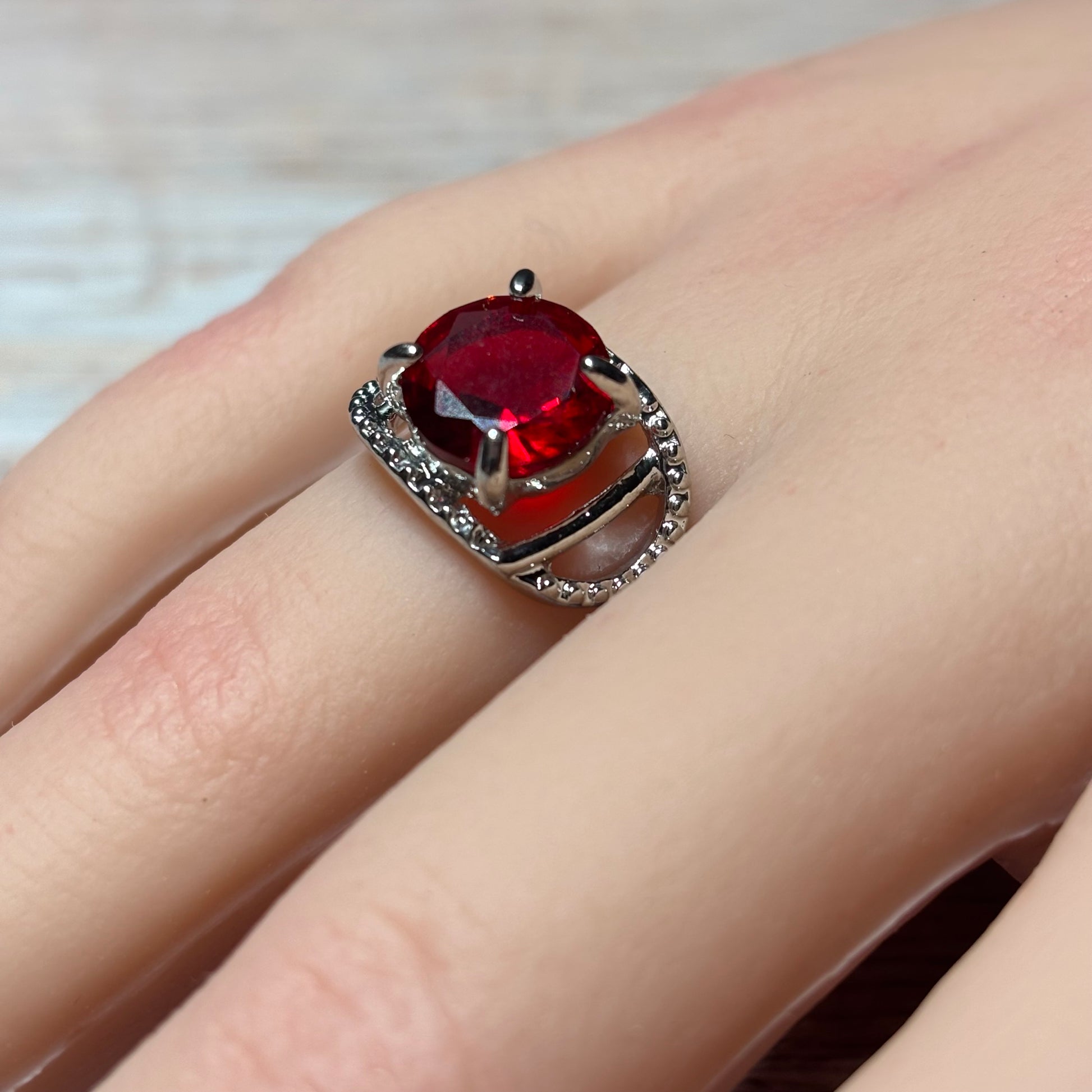 Indulge in elegance with our Ring Size 9 - Simulated Ruby. This exquisite ring features a mesmerizing simulated ruby, perfectly accented with sparkling crystals. Designed to add a touch of luxury to any outfit, this ring exudes sophistication and exclusivity. Elevate your style with this statement piece and make a bold impression.