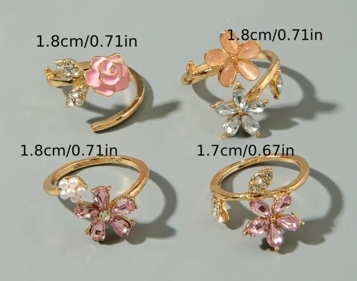 Elevate your everyday elegance with these gold-tone floral rings, where delicate craftsmanship meets versatile style. Each design features dimensional flower motifs adorned with pink and white enamel accents and sparkling cubic zirconia details that catch the light beautifully. The open, wrap-around band design positions the blooms gracefully atop your finger while the adjustable sizing ensures a perfect fit for any hand. Crafted from durable alloy with luxurious gold plating, these pieces offer sophisticated botanical-inspired jewelry that transitions seamlessly from day to evening wear.