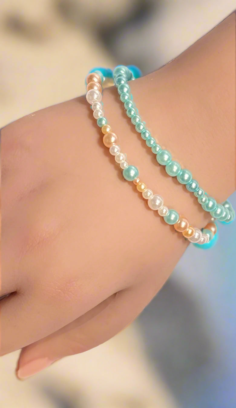 This handmade set of two beaded stretch bracelets combines faux pearls in white, peach, and light blue tones for a sophisticated, multi-colored look. The varying bead sizes create a layered effect that adds depth and visual interest. Designed for comfort and easy wear, these bracelets slip effortlessly over the wrist, making them ideal for both everyday use and special occasions.