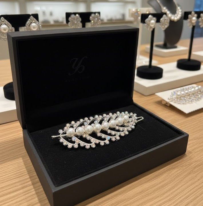 Elevate your everyday style with this elegant 2.5"x1" silver tone hair clip featuring a graceful leaf design. Adorned with lustrous faux pearls and sparkling rhinestones, this accessory adds a touch of sophistication to any hairstyle. Perfect for securing hair while making a refined statement, it combines timeless elegance with modern flair. Ideal for both casual outings and special occasions, this versatile clip brings understated glamour to your look.