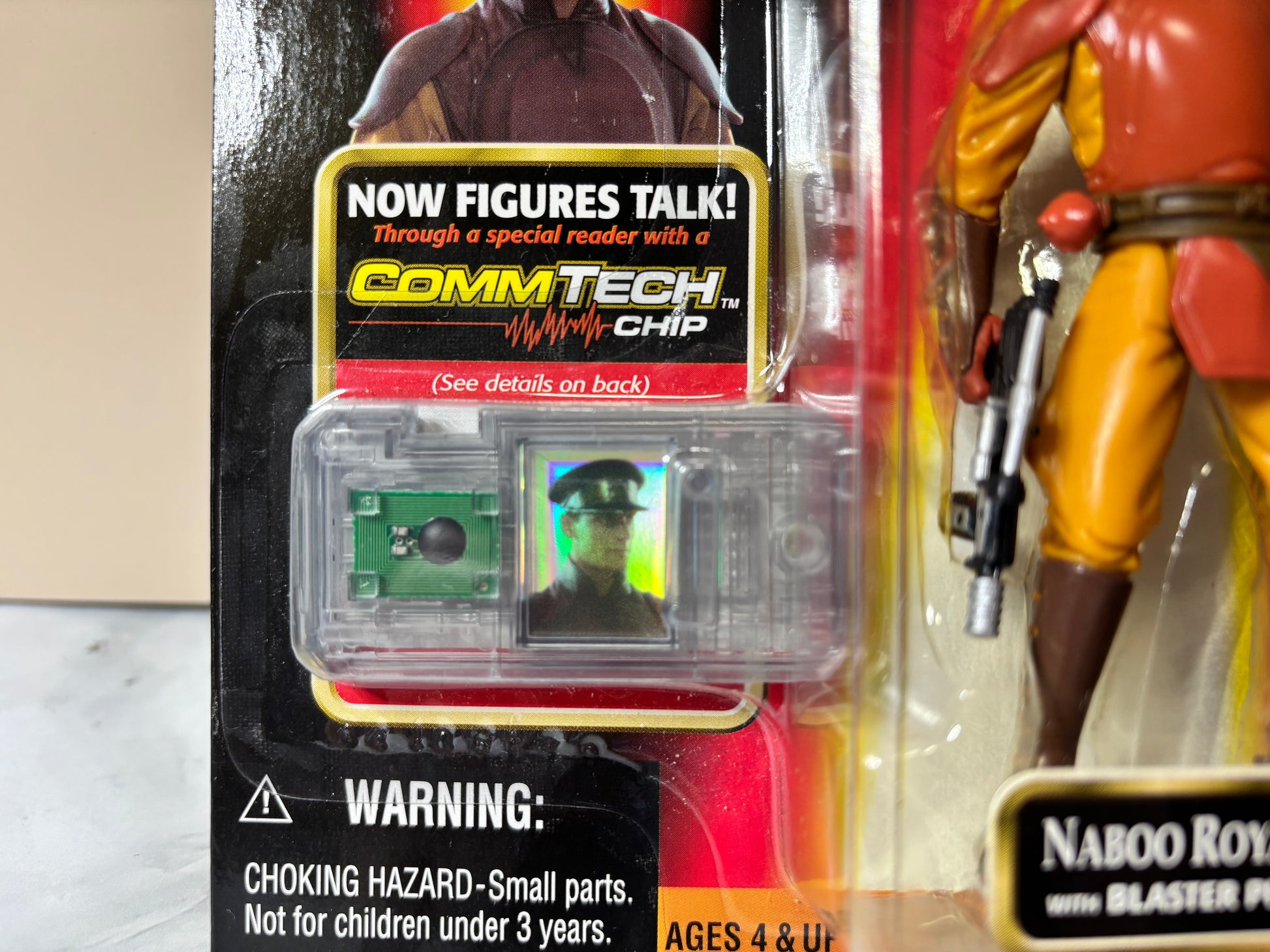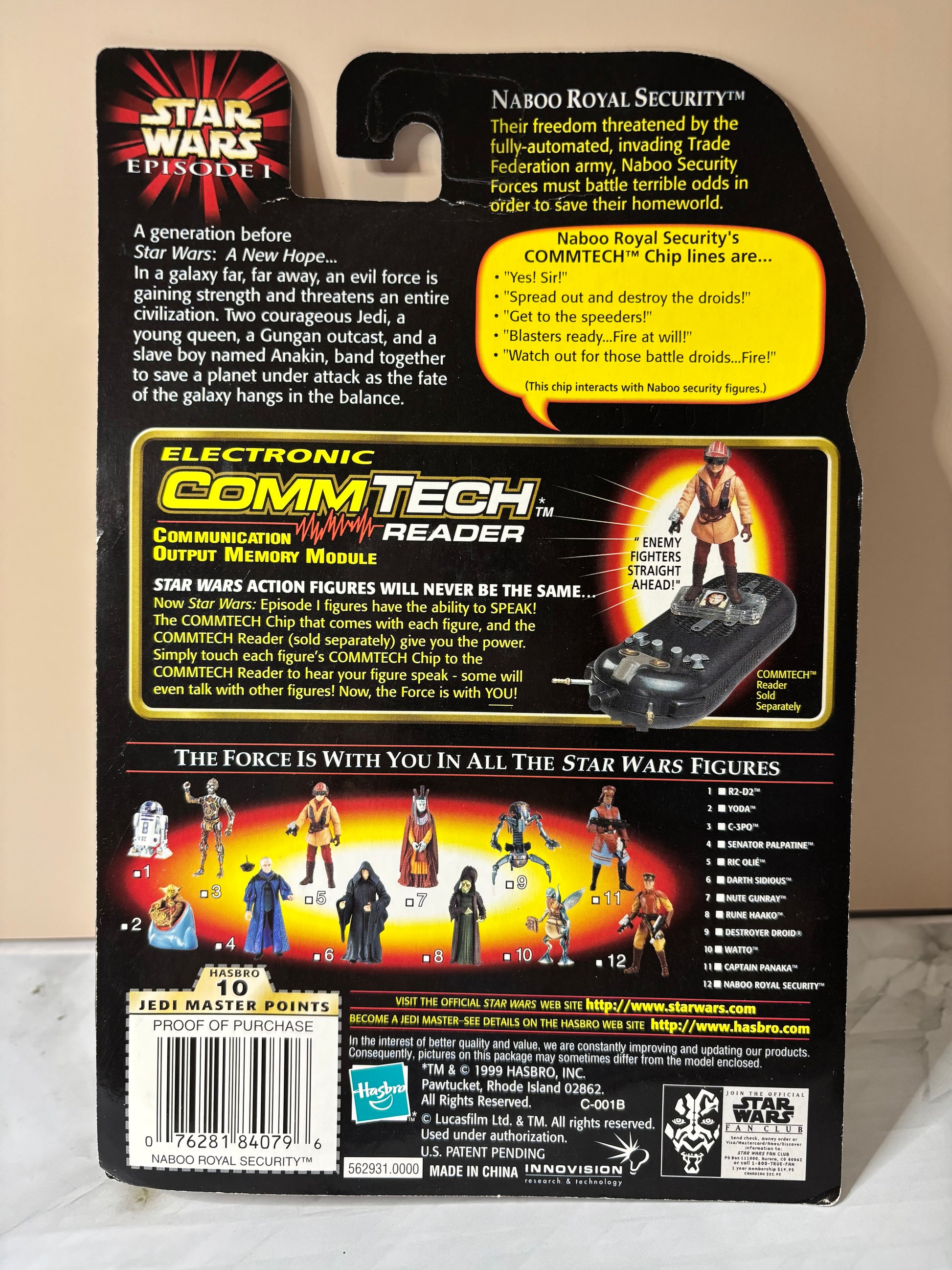 The Star Wars Episode 1 Naboo Royal Security action figure from 1999 is a collector's item still in its original packaging. With a special reader, the figures can talk through a Comm Tech Chip. This specific set includes a blaster pistol and rifle for added authenticity. Enhance your collection with this rare and unique item.