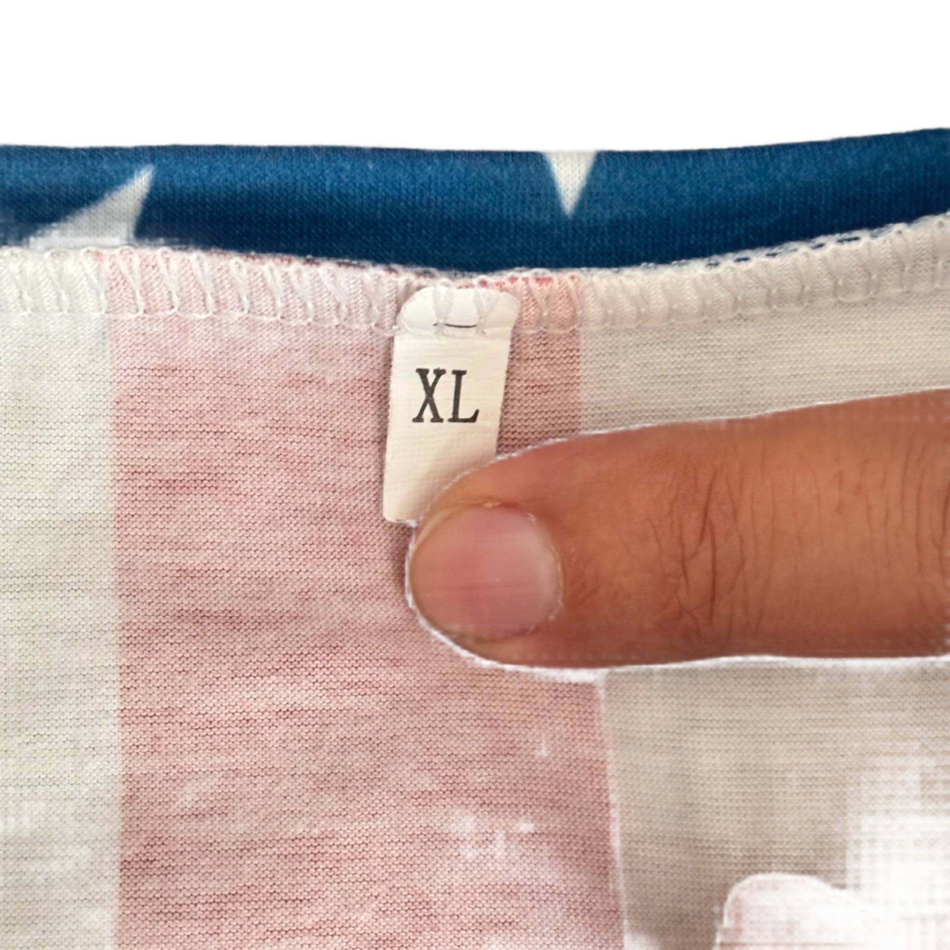 This women's top features a vibrant stars and stripes design in red, white, and blue. Made from a comfortable blend of 65% cotton and 35% polyester, it offers breathability and softness. The short sleeves and V-neck cut-out cold shoulder style add a trendy touch, while it has a button-front, it can also be worn by slipping it on like any tshirt. Designed in an extra-large size that runs slightly small, it provides a flattering fit with a stylish patriotic flair.